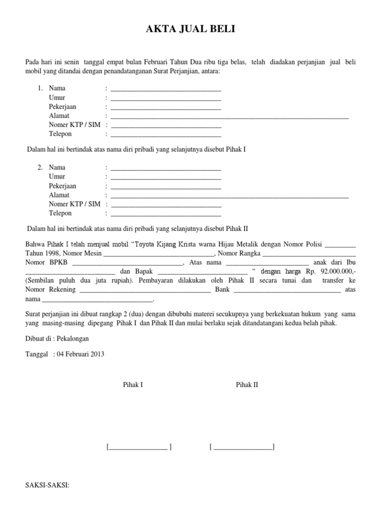 Draft Lengkap Surat Perjanjian Jual Beli Mobil Portalinvestasi Com