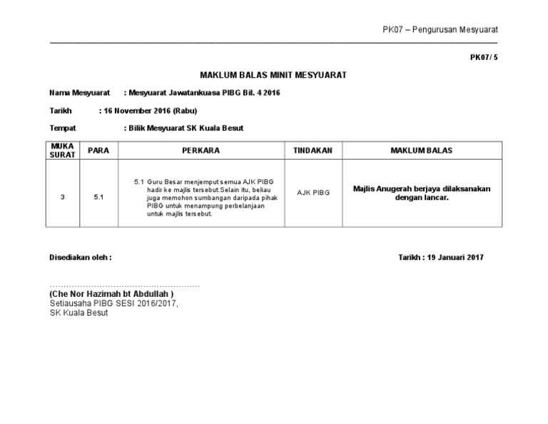 Borang Pk 07 5 Maklum Balas Minit Mesyuarat Kali Pertama 2017