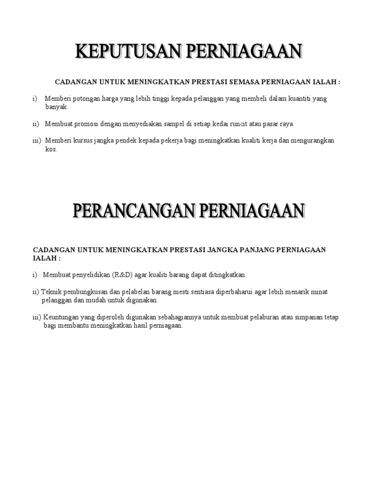 Cadangan Untuk Meningkatkan Prestasi Semasa Dan Jangka Panjang Perniagaan
