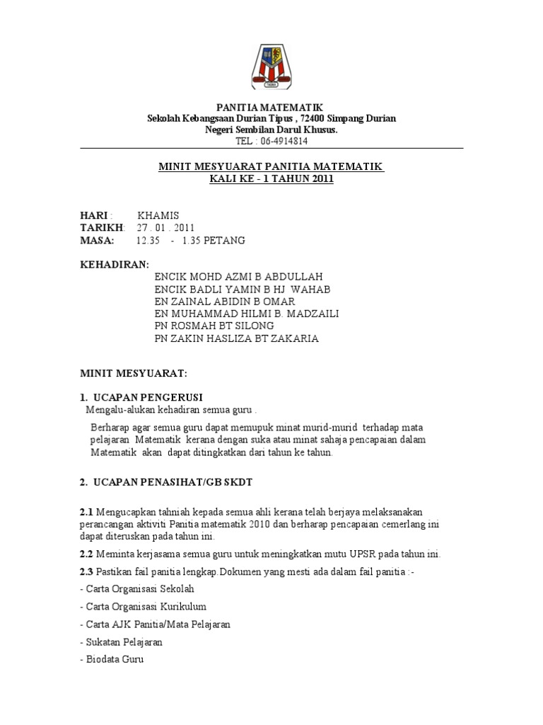 Contoh Minit Mesyuarat Panitia Matematik Kali Kedua Sekolah Rendah