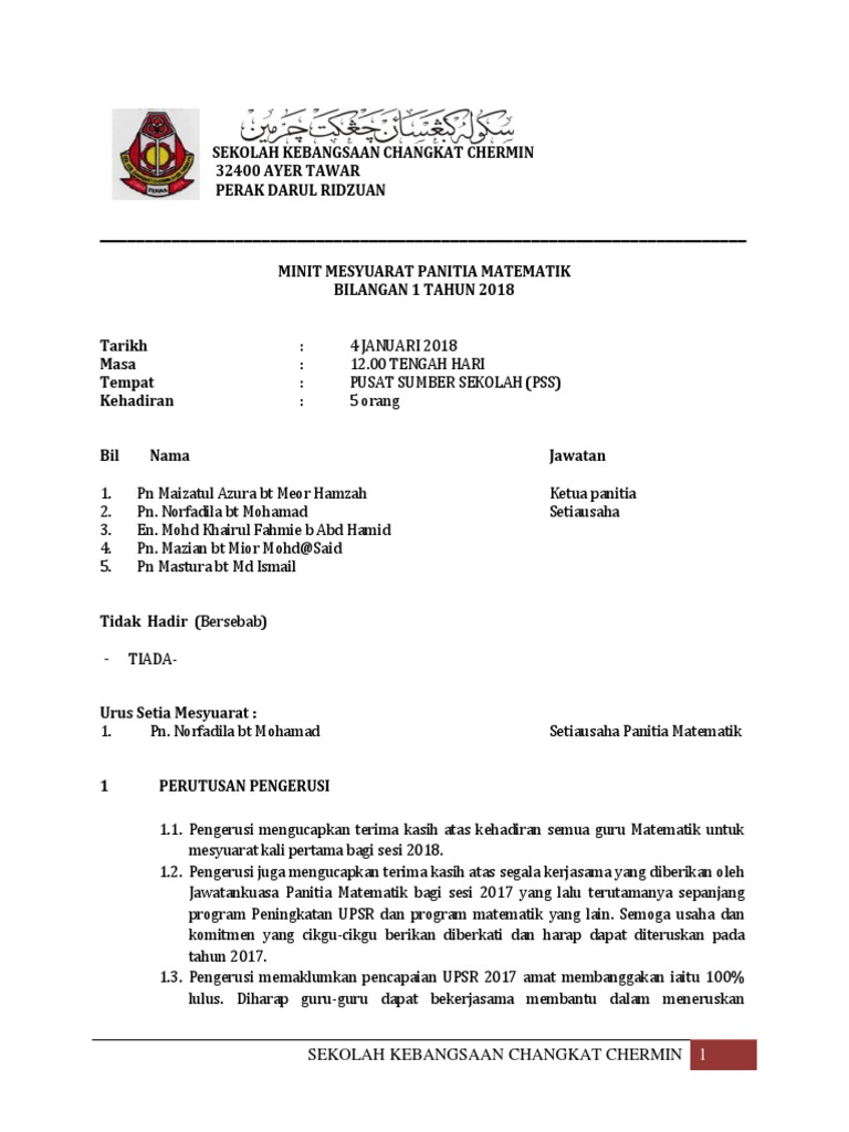 Doc Minit Mesyuarat Panitia Matematik Kali Pertama 2014 Hafiz Mohd Academia Edu