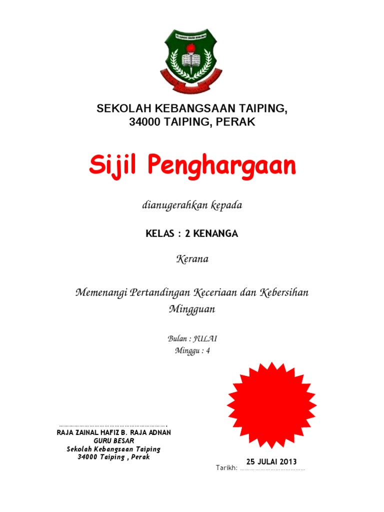 Contoh Sijil Penghargaan Kelas Bersih Tahap 1