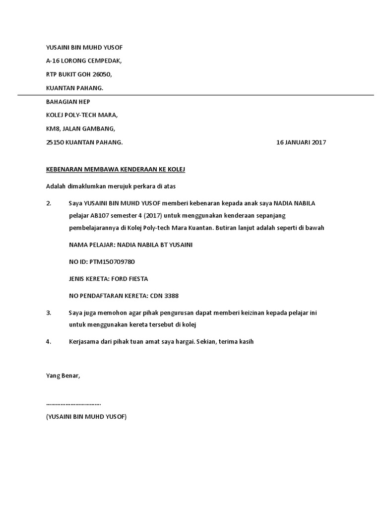 Contoh Surat Sokongan Ibubapa Pelatih Bagi Kebenaran Membawa Kenderaan Ke Kolej