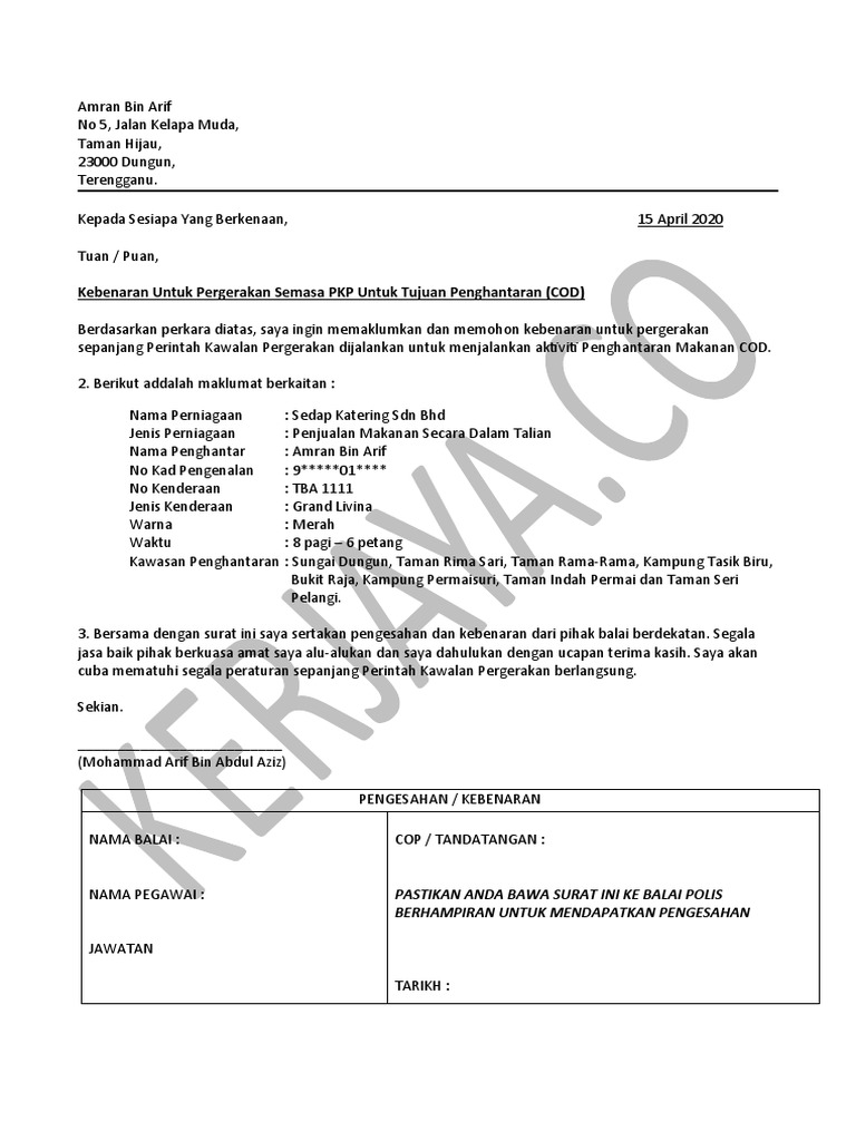 Contoh Surat Pelepasan Perjalanan Pkp Untuk Peniaga Pekerja Cod Barang