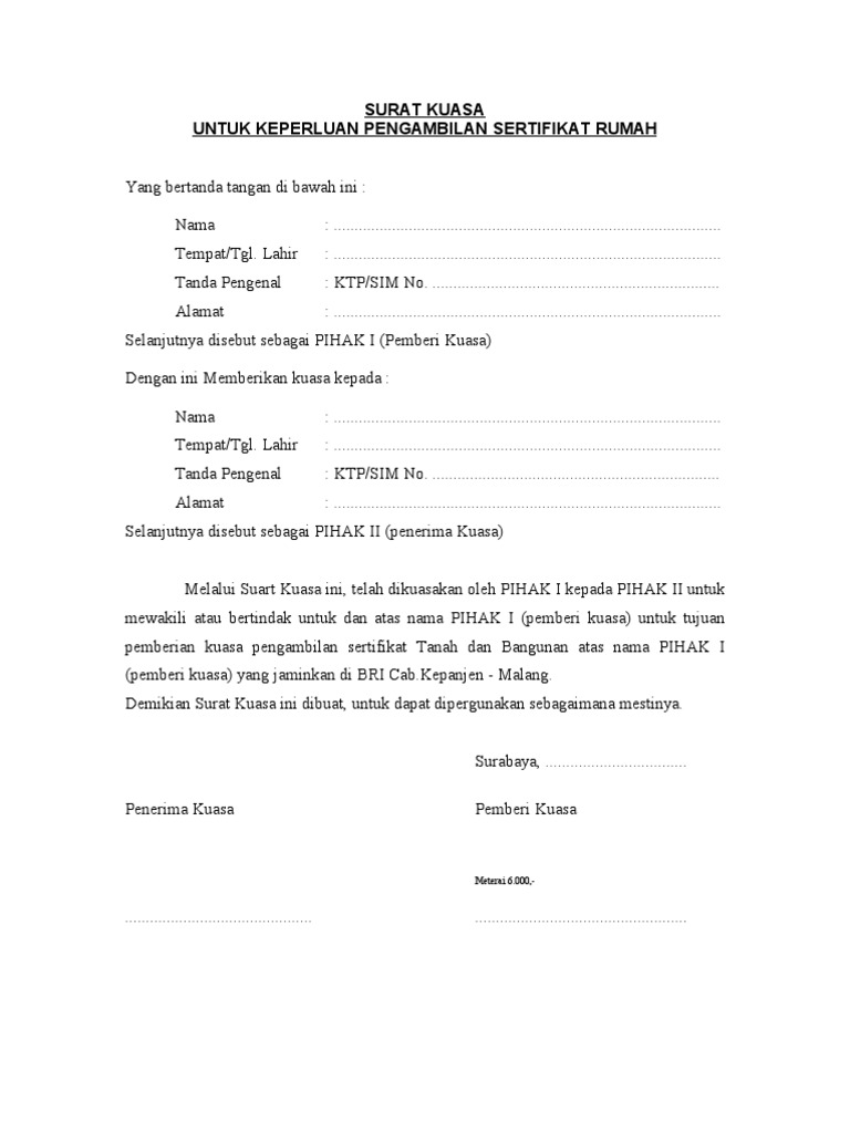 Contoh Surat Kuasa Pengambilan Sertifikat Rumah Di Bank Riskyobama