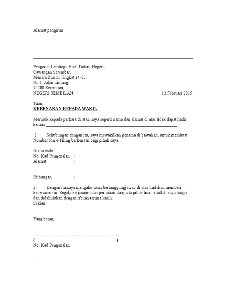 Contoh Surat Memberi Kebenaran Kepada Wakil