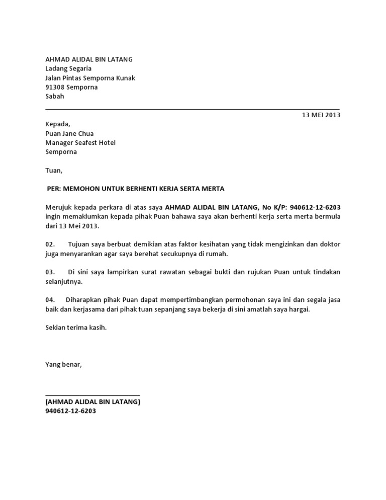 Surat Rasmi Berhenti Kerja Notis 2 Minggu Rasmi L