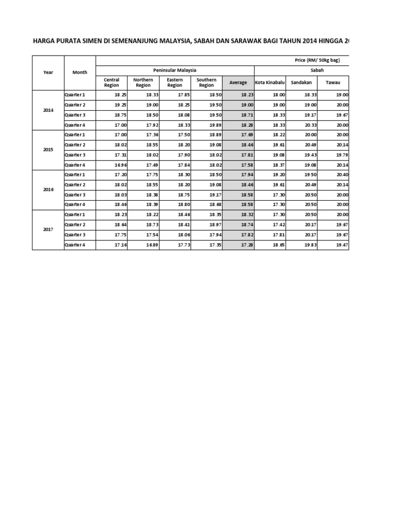 Harga Purata Simen Di Semenanjung Malaysia Sabah Dan Sarawak Bagi Tahun 2014 Hingga 2017