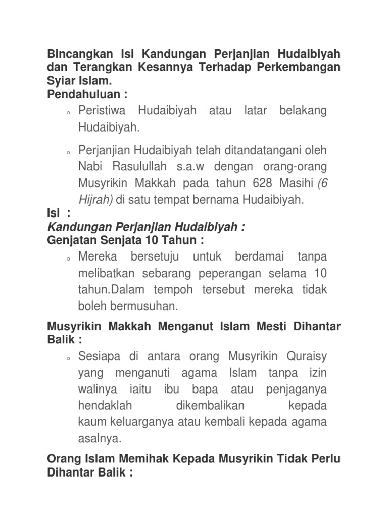 Bincangkan Isi Kandungan Perjanjian Hudaibiyah Dan Terangkan Kesannya Terhadap Perkembangan Syiar Islam