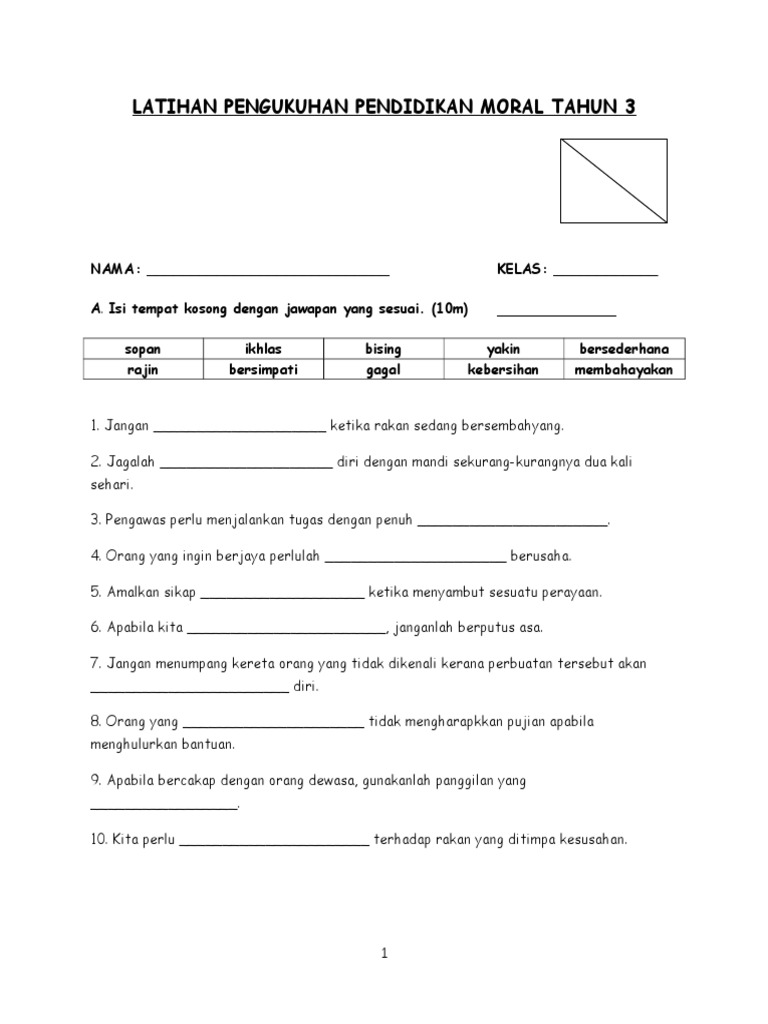 Soalan Pendidikan Moral Tahun 3 Ujian 1 Bulan Mac 2017 1 1