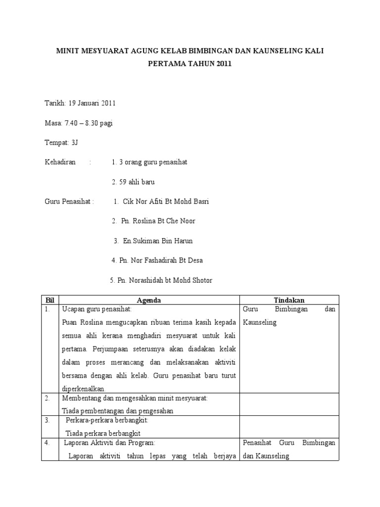 Contoh Minit Mesyuarat Kelab Bimbingan Dan Kaunseling
