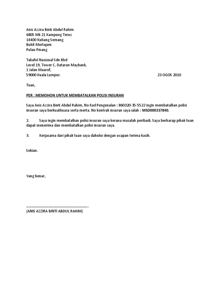Contoh Surat Rasmi Pembatalan Insurans Hellowinv