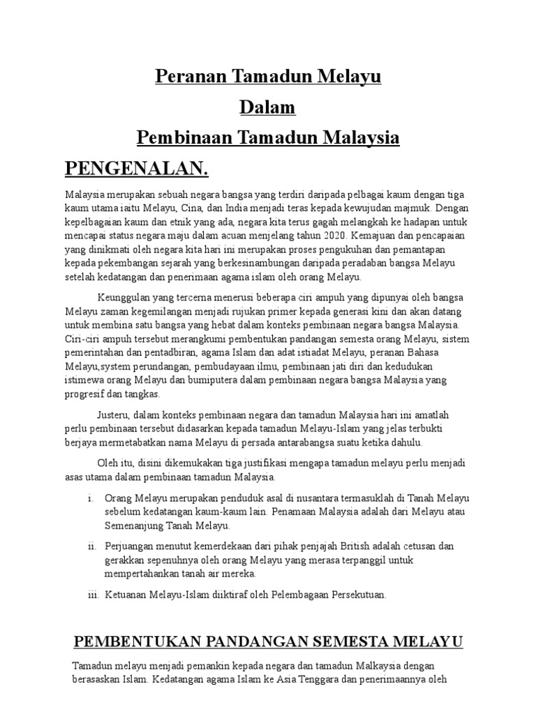 8173505 Peranan Tamadun Melayu Dalam Membina Tamadun Malaysia Peranan Tamadun Melayu Dalam Pembinaan Tamadun Malaysia Pengenalan Malaysia Merupakan Sebuah Studocu