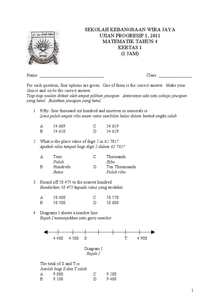 Ujian Progresif Matematik Tahun 4 Kertas 1