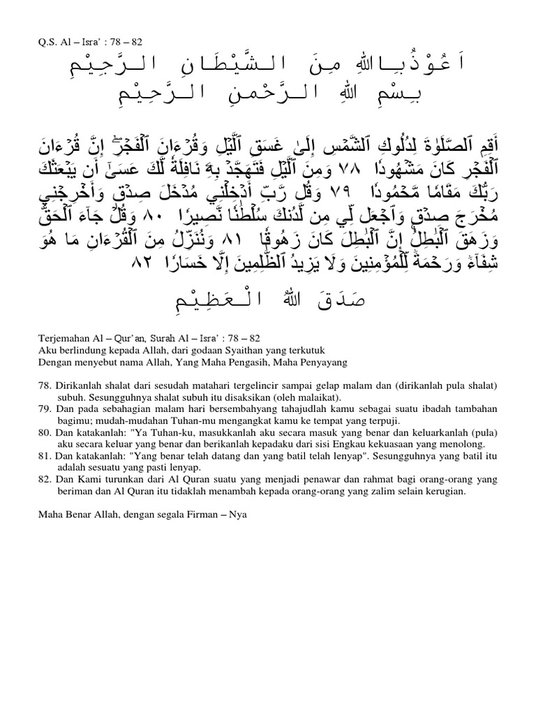 Bacaan Surat Al Isra Ayat 78 84 Tulisan Arab Terjemah Sakaran