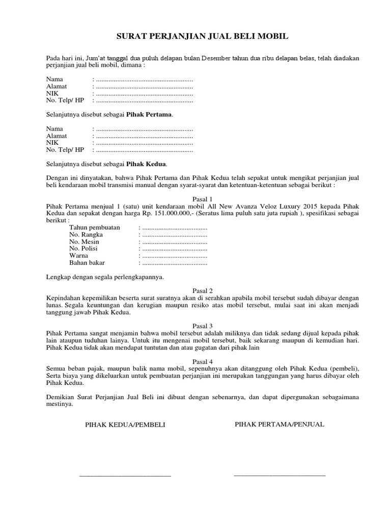 Draft Lengkap Surat Perjanjian Jual Beli Mobil Portalinvestasi Com