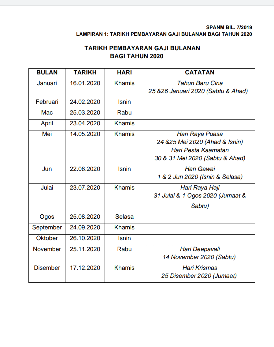 Jadual Dan Tarikh Pembayaran Gaji Penjawat Awam Tahun 2020