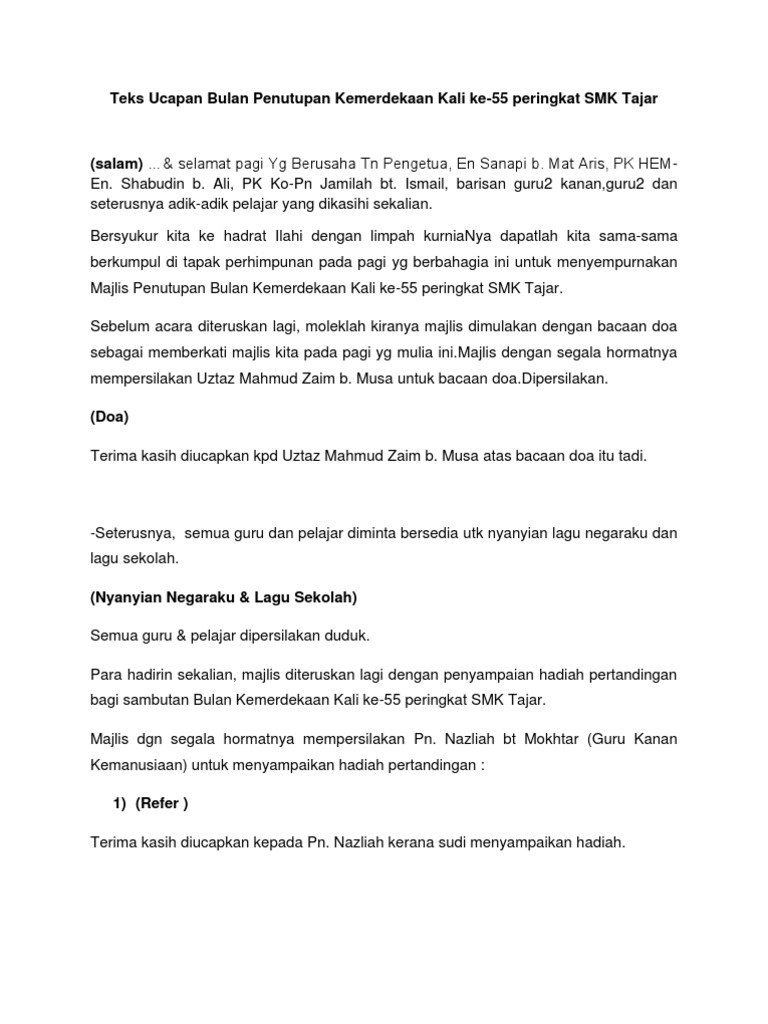 Teks Ucapan Majlis Penutup Bulan Kemerdekaan Doc Document