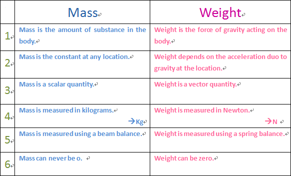 Difference Between Mass And Weight In Tabular Form Physics Notes Weight Mass